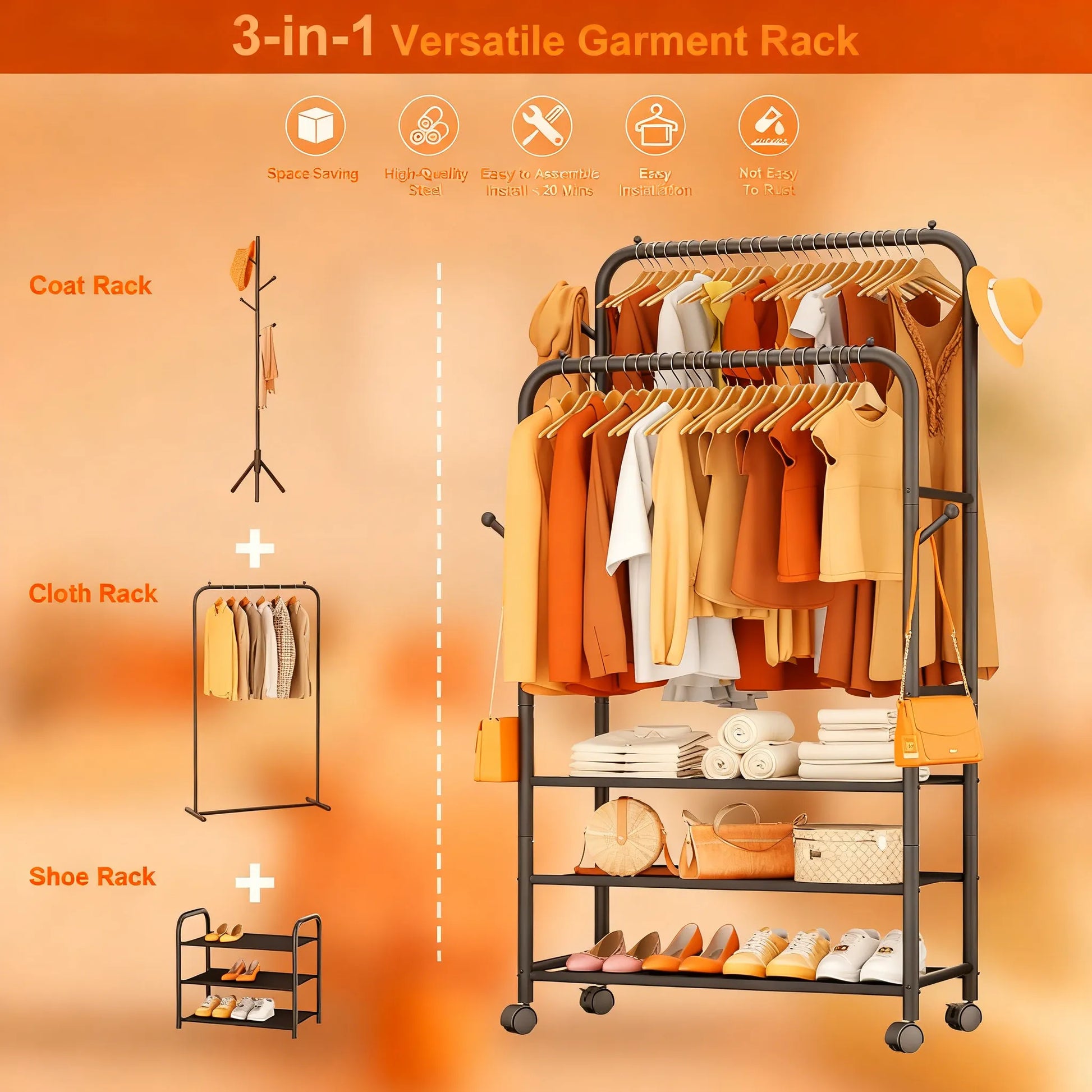 Adjustable 3-in-1 Rolling Garment Rack (3 Shelves)