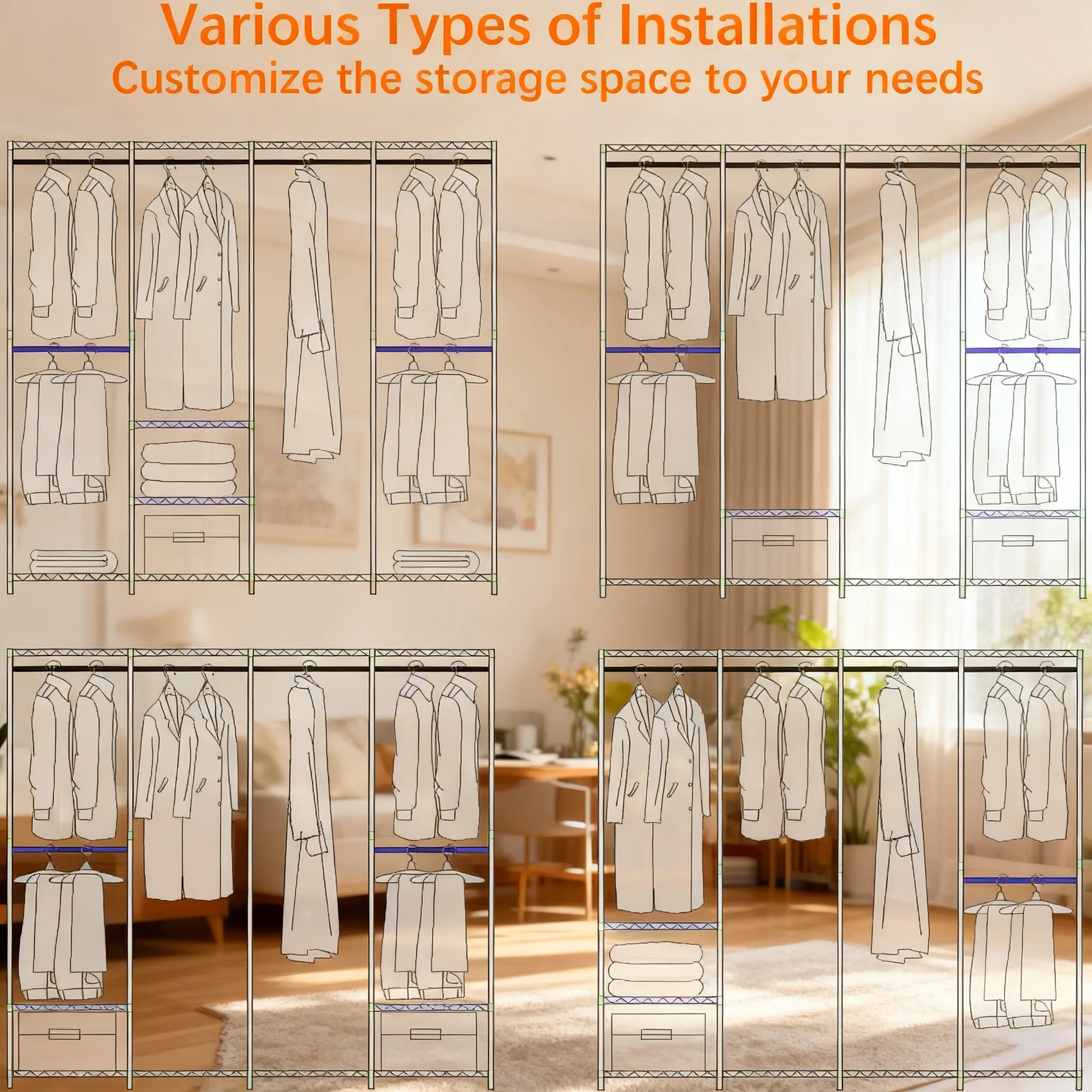 - Customizable design: Multiple installation layouts (hanging rods, shelves, drawers) to fit clothes, shoes, and accessories.